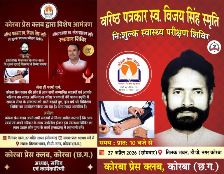 कोरबा। पत्रकारिता जगत की दो प्रमुख विभूतियों, स्व. रमेश पासवान और स्व. विजय सिंह की यादों को संजोते हुए कोरबा प्रेस क्लब आज सेवा की अलग मिसाल पेश करेगा। सोमवार, 27 अप्रैल को टीपी नगर स्थित तिलक भवन में विशाल स्वास्थ्य और रक्तदान शिविर का आयोजन किया जा रहा है। सुबह 10 बजे से शुरू होने वाले इस शिविर में मेडिकल कॉलेज के विशेषज्ञ डॉक्टर अपनी सेवाएँ देंगे। प्रेस क्लब ने सभी से इस अवसर पर सहभागी बनने की अपील की है।