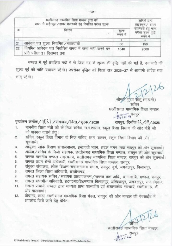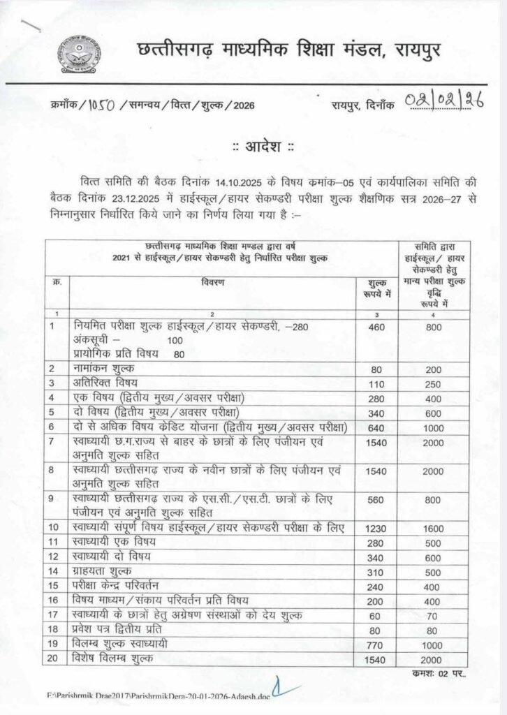 रायपुर। छत्तीसगढ़ माध्यमिक शिक्षा मंडल रायपुर की वित्त समिति ने परीक्षा शुल्कों में वृद्धि करने का निर्णय लिया है नया परीक्षा शुल्क इस प्रकार है