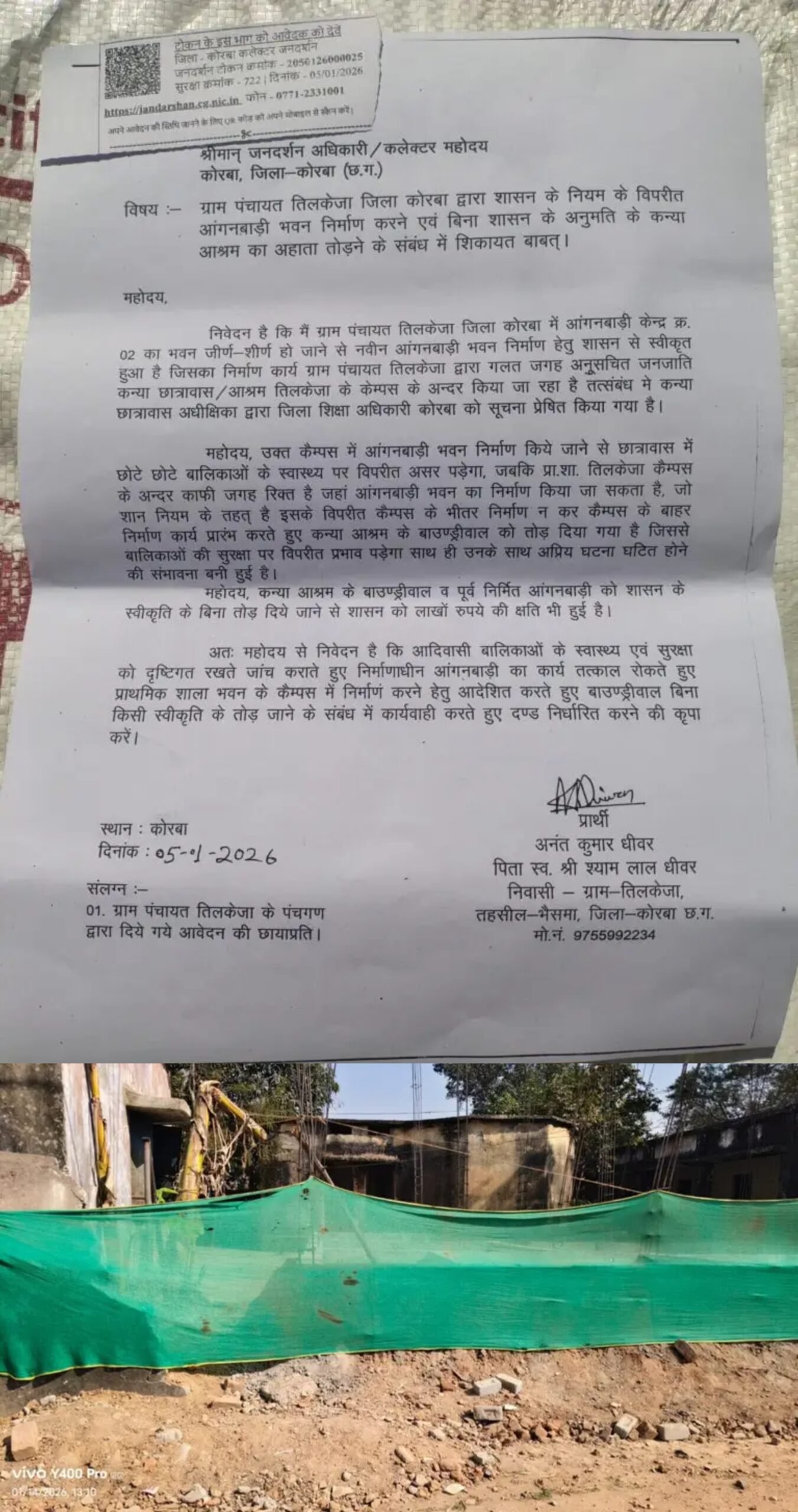 मामले को लेकर ग्राम तिलकेजा निवासी अनंत कुमार धीवर ने कलेक्टर कोरबा को लिखित शिकायत सौंपते हुए कहा है कि आंगनबाड़ी केंद्र क्रमांक 02 के जर्जर भवन के स्थान पर नए भवन निर्माण की स्वीकृति तो शासन से ली गई, लेकिन ग्राम पंचायत द्वारा जानबूझकर गलत स्थल का चयन किया गया। आरोप है कि नियमों के विपरीत कन्या आश्रम के कैंपस के अंदर जबरन निर्माण कराया जा रहा है।