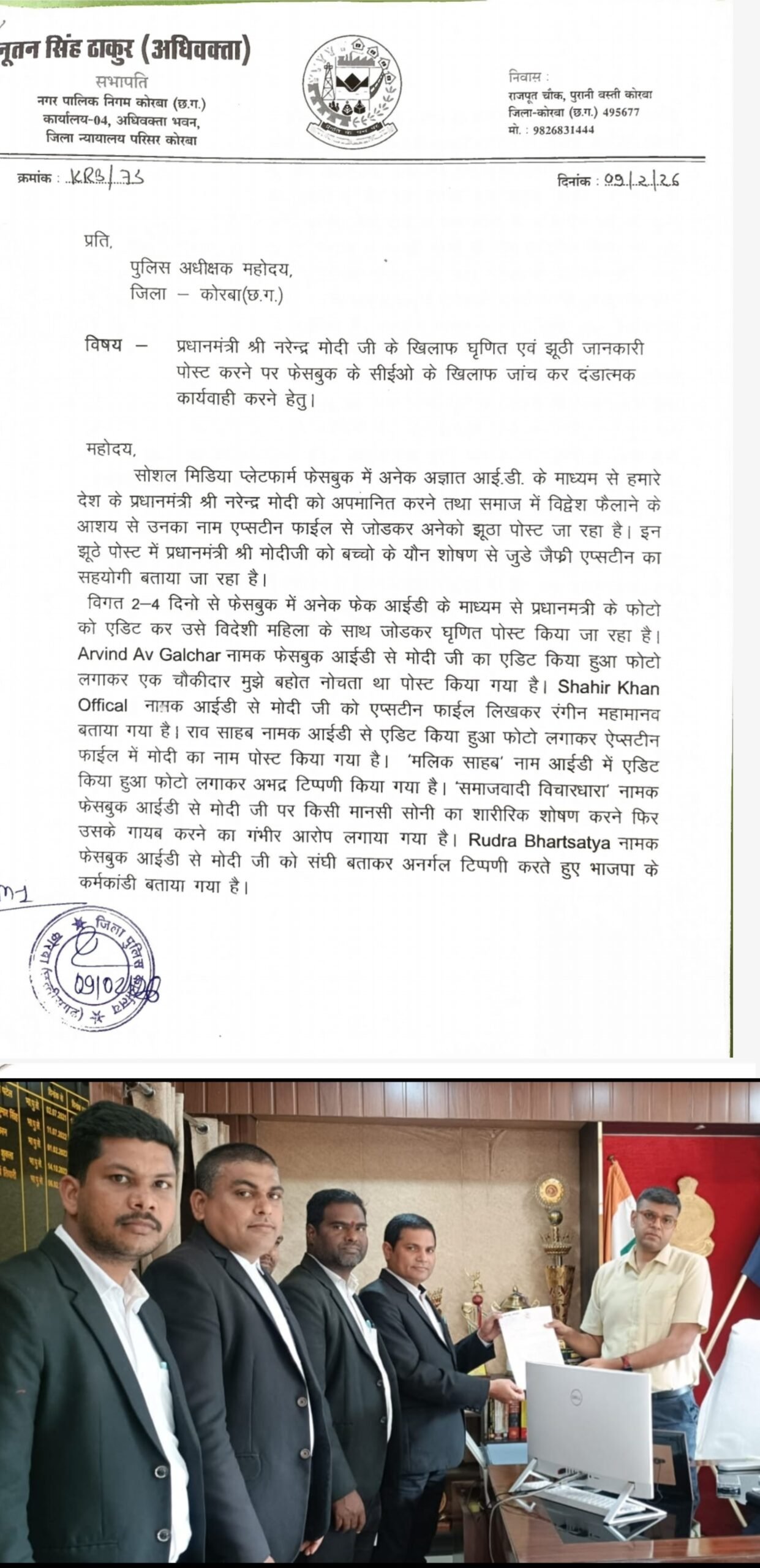 सोशल मिडिया प्लेटफार्म फेसबुक में अनेक अज्ञात आई.डी. के माध्यम से देश के प्रधानमंत्री नरेन्द्र मोदी के चरित्र पर लांछन लगाने तथा समाज में विद्वेश फैलाने के आशय से अनेको झूठा पोस्ट जा रहा है जिस पर नगर निगम कोरबा सभापति नूतनसिंह ठाकुर ने पुलिस अधीक्षक कोरबा को लिखित शिकायत देकर कड़ी कार्रवाई की मांग किया है। झूठे पोस्ट में प्रधानमंत्री मोदीजी को बच्चो के यौन शोषण अपराधी जैफी एप्सटीन का सहयोगी बताया जा रहा है।