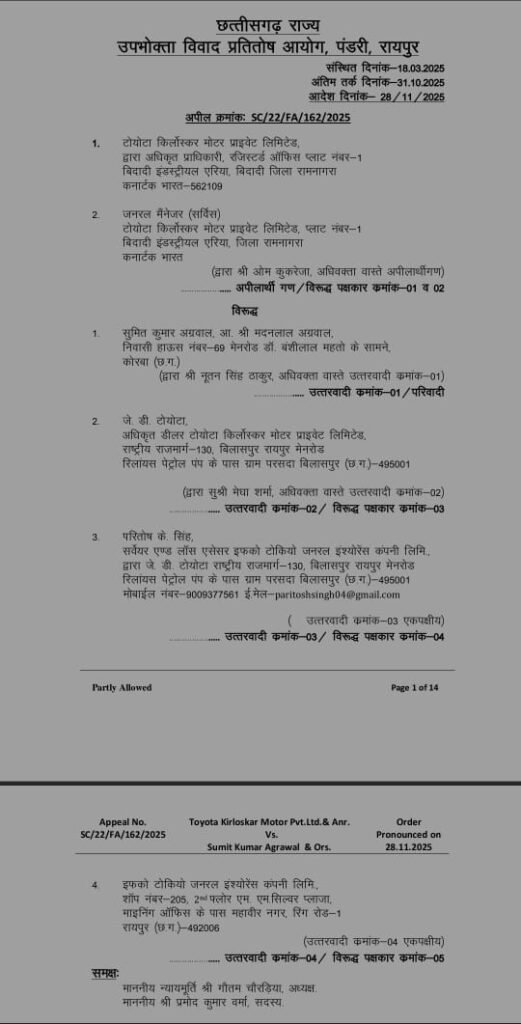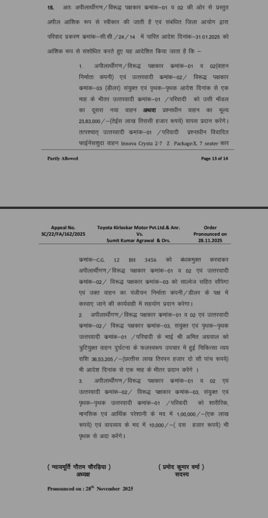 दोनों पक्षों की सुनवाई करने के बाद राज्य आयोग ने 28.11.2025 फैसला दिया कि टोयोटा कंपनी 30 दिन के भीतर सुमित अग्रवाल को नया इनोवा कार या उसका मूल्य 23.83 लाख रुपए सहित इलाज का संपूर्ण खर्च 36.53 लाख रुपए देगा। साथ ही 01 लाख रुपए शारीरिक, मानसिक परेशानी के लिए तथा 10 हजार रुपए वादव्यय देगा।