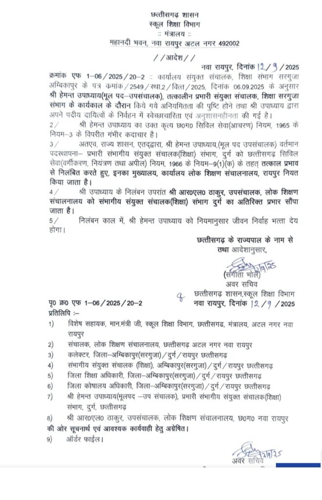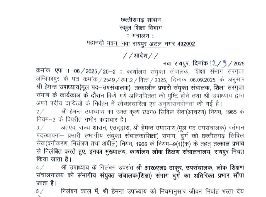 दुर्ग के प्रभारी संयुक्त संचालक (जेडी) हेमंत उपाध्याय को निलंबित कर दिया गया है। उनकी जगह डीपीआई के डिप्टी डायरेक्टर आरपी ठाकुर को दुर्ग संभाग का अतिरिक्त प्रभार दिया गया है। उपाध्याय पर सरगुजा में पोस्टिंग के दौरान वित्तीय अनियमितता और स्वेच्छारिता के आरोप लगे थे। उन्होंने मार्च 2024 से सितंबर 2024 तक की अवधि के लिए बिना सक्षम अधिकारी से अवकाश स्वीकृति प्राप्त किए वेतन आहरण किया था। इसके अलावा, उन्होंने 4 शिक्षकों को नियम विरुद्ध जिला शिक्षा प्रशिक्षण संस्थान में पदस्थ किया था। निलंबन के दौरान उपाध्याय को डीपीआई में संलग्न किया गया है.।