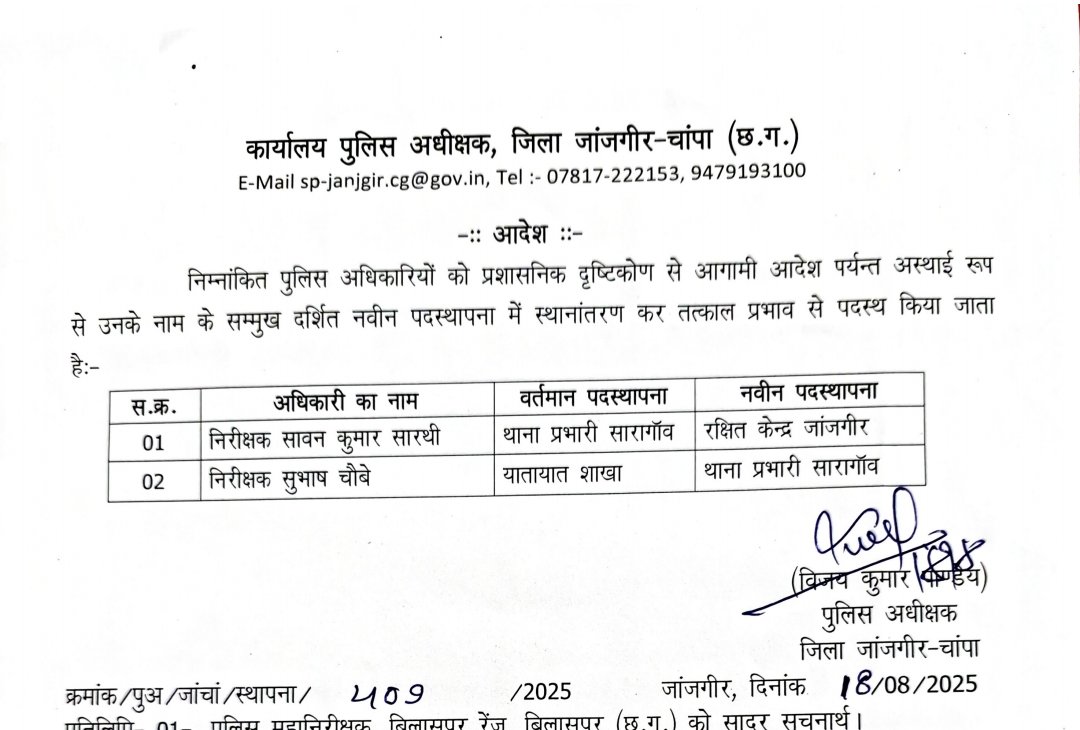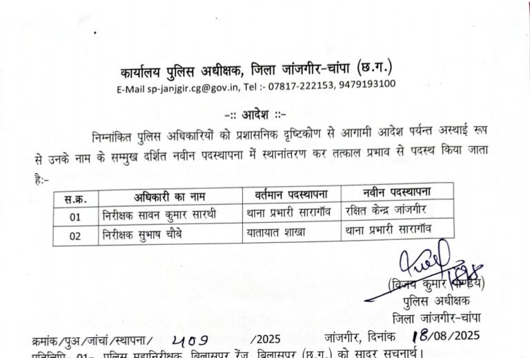 जांजगीर-चांपा पुलिस अधीक्षक ने हाल ही में पुलिस विभाग में कुछ बदलाव किए हैं। निरीक्षक सावन कुमार सारथी को थाना प्रभारी सारागॉव से रक्षित केंद्र जांजगीर और निरीक्षक सुभाष चौबे को यातायात शाखा से थाना प्रभारी सारागॉव के रूप में स्थानांतरित किया गया है। यह बदलाव तत्काल प्रभाव से लागू होंगे और आगामी आदेश तक अस्थायी रूप से लागू रहेंगे।