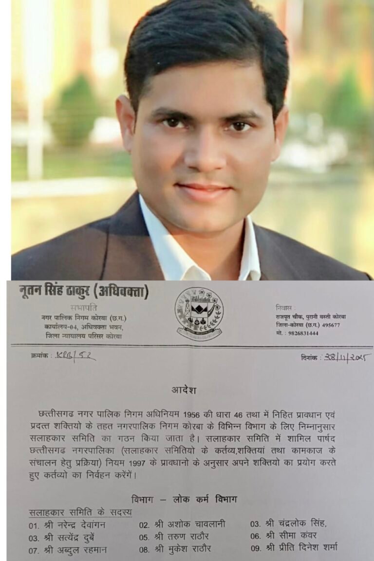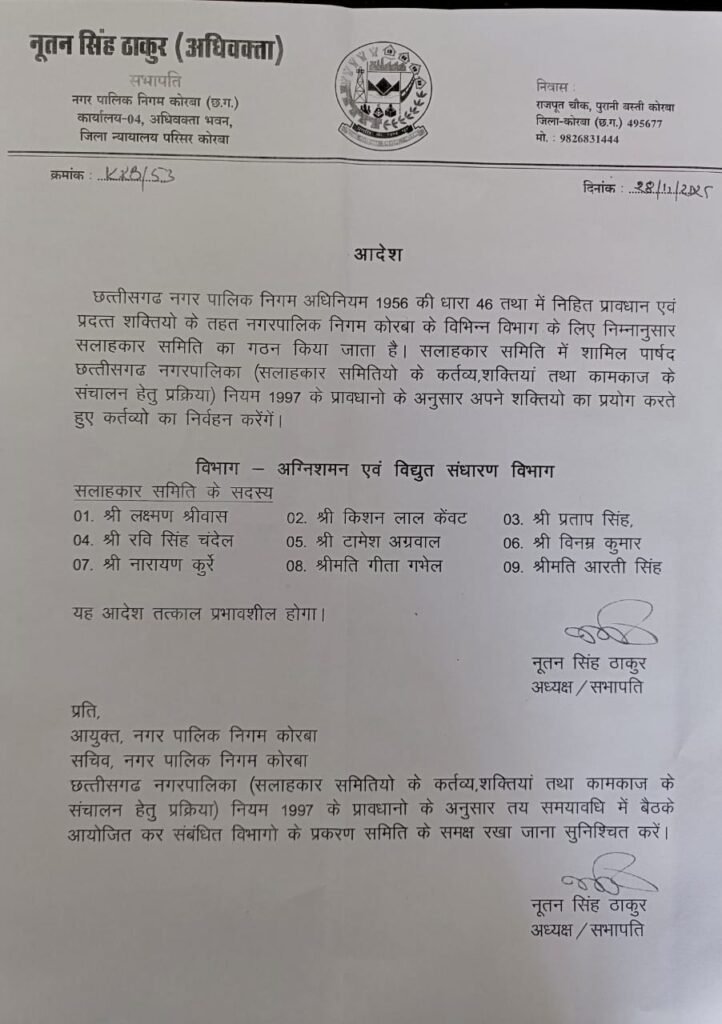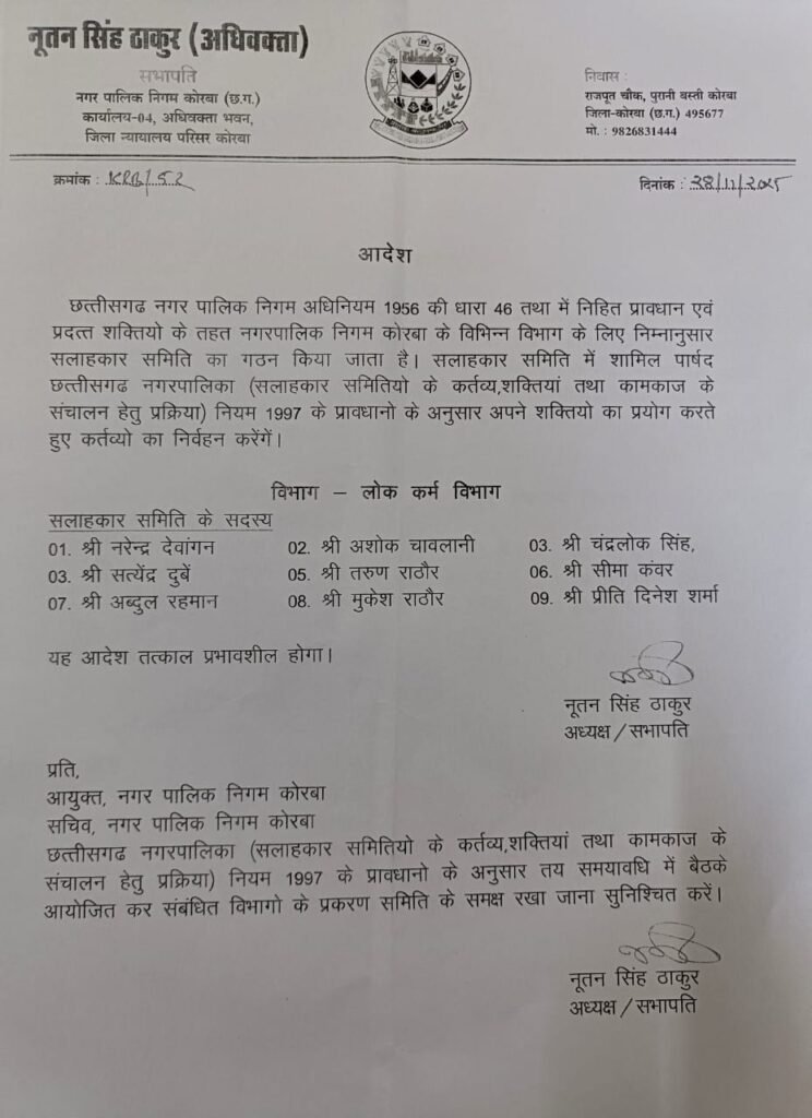 छत्तीसगढ़ नगर पालिक निगम कोरबा के प्रावधान के अनुसार नगर पालिक निगम अध्यक्ष व सभापति नूतनसिंह ठाकुर ने आज 02 विभागों में सलाहकार समिति के गठन किया है।