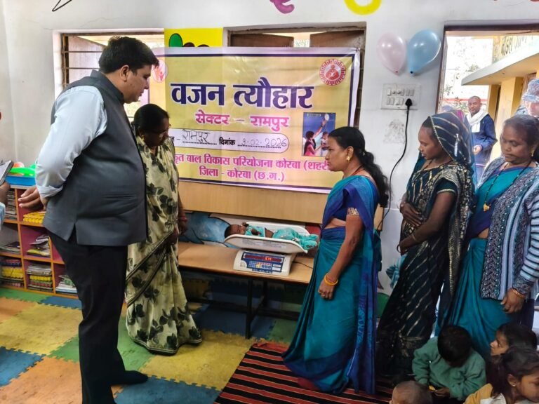 शासन के निर्देशानुसार वजन त्यौहार 2026 का शुभारंभ आज आंगनबाड़ी केन्द्र रामपुर-1, सेक्टर रामपुर, कोरबा (शहरी) में कलेक्टर श्री कुणाल दुदावत द्वारा किया गया। कार्यक्रम में जिला कार्यक्रम अधिकारी श्री बसंत मिंज, वार्ड पार्षद श्रीमती ममता यादव तथा परियोजना अधिकारी श्री मनोज अग्रवाल उपस्थित रहे।