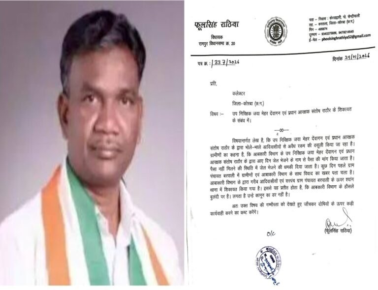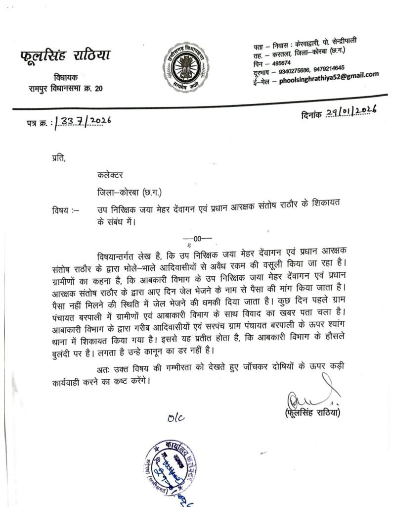 विधायक द्वारा कलेक्टर को भेजे गए पत्र में कहा गया है कि आबकारी विभाग में पदस्थ उप निरीक्षक जया मेहर देवांगन एवं प्रधान आरक्षक संतोष राठौर द्वारा श्यांग थाना क्षेत्र के आदिवासी बहुल गांवों में भय का माहौल बनाया जा रहा है। आरोप है कि ग्रामीणों को झूठे मामलों में फंसाने और जेल भेजने की धमकी देकर उनसे अवैध रूप से पैसों की मांग की जा रही है। ग्रामीणों का कहना है कि मांग पूरी न होने पर उनके खिलाफ झूठे प्रकरण दर्ज करने की चेतावनी दी जाती है।