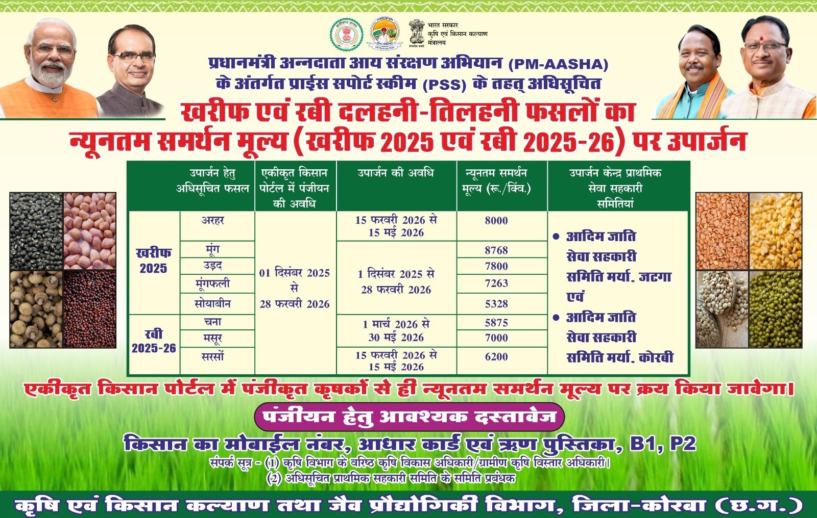 उपार्जन की अवधि मूंग, उड़द, मूंगफली एवं सोयाबीन हेतु 01 दिसंबर 2025 से 28 फरवरी 2026 तक, अरहर एवं सरसों के लिए 15 फरवरी 2026 से 15 मई 2026 तक तथा चना एवं मसूर के लिए 01 मार्च 2026 से 30 मई 2026 तक आदिम जाति सेवा सहकारी समिति जटगा एवं कोरबी (पोड़ीउपरोड़ा) में किया जाएगा। उपार्जन हेतु फसलों का न्यूनतम समर्थन मूल्य निर्धारित है जिसमें अरहर – 08 हजार रुपए प्रति क्विंटल, मूंग-8768 हजार रुपए प्रति क्विंटल, उड़द-7800 हजार रुपए प्रति क्विंटल, मूंगफली-7263 हजार रुपए प्रति क्विंटल, सोयाबीन-5328 रुपए प्रति क्विंटल, चना-5875 रुपए प्रति क्विंटल, मसूर-07 हजार रुपए प्रति क्विंटल एवं सरसों-6200 रुपए प्रति क्विंटल निर्धारित है।