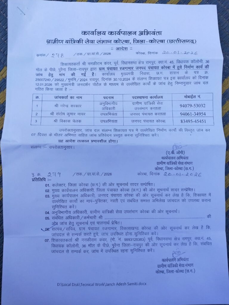 कोरबा। रामपुर विधानसभा क्षेत्र अन्तर्गत जनपद पंचायत कोरबा के ग्राम पंचायत रजगामार में हुए निर्माण कार्यों की अब जांच की जाएगी। साल 2024 में पूर्व गृहमंत्री ननकी राम कंवर की शिकायत पर अब भ्रष्टाचार पोल खुलेगी। ग्रामीण यांत्रिकी सेवा संभाग कार्यपालन अभियंता एके जोगी ने जांच के लिए तीन सदस्यीय टीम गठित की है। टीम शिकायत पत्र में उल्लेखित निर्माण कार्यों की विस्तृत जांच कर सात दिवस के भीतर अभिमत सहित जांच प्रतिवेदन पेश करेगी।