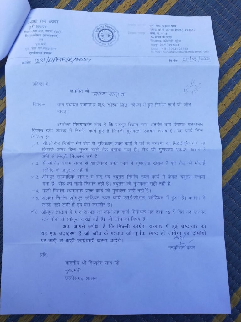 पूर्व गृहमंत्री ननकी राम कंवर ने साल 2024 में मुख्यमंत्री विष्णुदेव साय से रजगामार पंचायत में हुए निर्माण कार्यों की जांच को लेकर पत्र लिखा था। सीएम को लिखे पत्र उल्लेख किया गया था कि रामपुर विधानसभा अंतर्गत ग्राम पंचायत रजगामार विकास खंड कोरबा में निर्माण कार्य हुए हैं, जिनकी गुणवत्ता एकदम खराब है। सीसी रोड निर्माण मेन रोड से मुक्तिधाम कार्य में पूर्व से मनरेगा का मिट्टीकृत मार्ग था। जिसके ऊपर बिना मुरूम डाले रोड बनाया गया है। रोड की गुणवत्ता बेहद खराब है अभी से मिट्टी निकलने लगा है। सीसी रोड श्याम नगर से शांतिनगर के कार्य में गुणवत्ता खराब है एवं रोड की मोटाई स्टीमेंट के अनुसार नहीं है। ओमपुर साप्ताहिक बाजार में शेड एवं चबूतरा निर्माण कार्य में केवल चबूतरा बनाया गया हैं। शेड का नामो निशान नही है। चबूतरा की गुणवत्ता सही नही है। नाली निर्माण श्यामनगर के कार्य की गुणवत्ता सही नही है। अहाता निर्माण ओमपुर स्टेडियम तक का कार्य एसईसीएल स्टेडियम में हुआ है। कालम में जाली नही लगी है एवं बेस कमजोर है। ओमपुर तालाब में गाद सफाई का कार्य विधायक मद तथा 15 वें वित मद जनपद स्तर दोनों से स्वीकृत कराई गई है। जो जाँच का विषय है। श्री कंवर ने पत्र में कहा था कि पिछली कांग्रेस सरकार में हुई भ्रष्टाचार का यह एक उदाहरण है, जो जाँच के पश्चात पूर्णत: स्पष्ट हो जाएगा। उन्होंने दोषियों पर कड़ी से कड़ी कार्रवाई की मांग की थी। जिस पर मुख्यमंत्री कार्यालय से आवश्यक कार्रवाई करने का कलेक्टर को आदेश जारी किया गया था। जिस पर अब ग्रामीण यांत्रिकी सेवा संभाग कार्यपालन अभियंता ने ग्राम पंचायत रजगामार में हुए निर्माण कार्य की जांच को लेकर दल का गठन किया है। जांच दल में विभाग के अनुविभागीय अधिकारी नरेन्द्र सरकार, जनपद पंचायत करतला उप अभियंता संतोष कुमार नायर व विकास चेलक उप अभियंता जनपद कोरबा को शामिल किया गया है। जिन्हें सात दिवस के भीतर जांच रिपोर्ट प्रस्तुत करने कहा गया है।