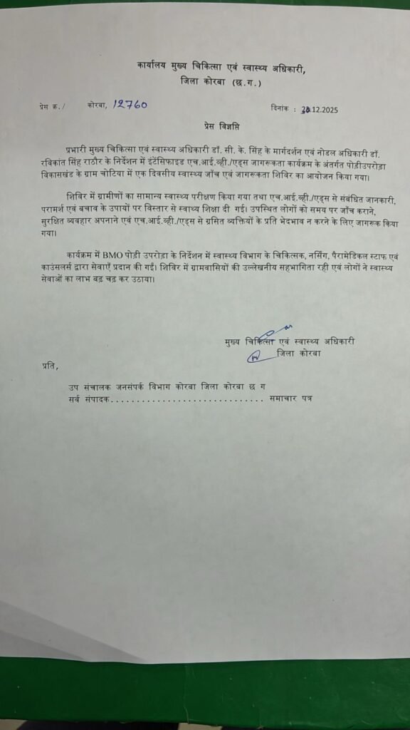 प्रभारी मुख्य चिकित्सा एवं स्वास्थ्य अधिकारी डॉ. सी. के. सिंह के मार्गदर्शन एवं नोडल अधिकारी डॉ. रविकांत सिंह राठौर के निर्देशन में इंटेंसिफाइड एच.आई.व्ही./एड्स जागरूकता कार्यक्रम के अंतर्गत पोड़ीउपरोड़ा विकासखंड के ग्राम चोटिया में एक दिवसीय स्वास्थ्य जाँच एवं जागरूकता शिविर का आयोजन किया गया।