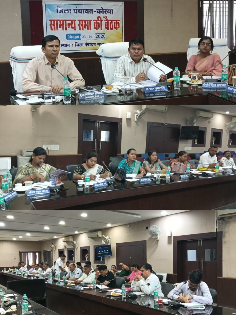 कोरबा/23 अप्रैल 2026/जिला पंचायत कोरबा की सामान्य सभा की बैठक गुरुवार को जिला पंचायत सभा कक्ष में आयोजित की गई। बैठक की अध्यक्षता जिला पंचायत अध्यक्ष डॉ. पवन कुमार सिंह ने की। बैठक में मुख्य कार्यपालन अधिकारी दिनेश कुमार नाग सहित विभिन्न विभागों के जिला स्तरीय अधिकारी उपस्थित रहे।अध्यक्ष डॉ. पवन कुमार सिंह ने कहा कि सामान्य सभा की मासिक बैठक पंचायत एवं ग्रामीण विकास से जुड़े विषयों के लिए अत्यंत महत्वपूर्ण है। उन्होंने निर्देशित किया कि सभी संबंधित अधिकारी अनिवार्य रूप से बैठक में उपस्थित रहें, ताकि ग्राम विकास से जुड़े मुद्दों पर प्रभावी चर्चा सुनिश्चित हो सके।इस अवसर पर सीईओ दिनेश कुमार नाग ने अधिकारियों को निर्देश दिए कि वे अपने-अपने विभागों की तथ्यात्मक एवं अद्यतन जानकारी के साथ बैठक में उपस्थित हों, जिससे सदन को योजनाओं की स्पष्ट एवं विस्तृत जानकारी उपलब्ध कराई जा सके।बैठक में जिले में संचालित विभिन्न विकास कार्यों एवं जनहितकारी योजनाओं की व्यापक समीक्षा की गई। महिला एवं बाल विकास विभाग अंतर्गत पोषण योजनाओं एवं रेडी-टू-ईट वितरण की स्थिति पर चर्चा हुई। शिक्षा विभाग की आगामी कार्ययोजना की समीक्षा की गई। लोक स्वास्थ्य यांत्रिकी विभाग के अंतर्गत ग्रामीण क्षेत्रों में खराब पड़े हैंडपंपों के सुधार एवं मरम्मत के निर्देश दिए गए तथा पेयजल आपूर्ति सुनिश्चित करने पर जोर दिया गया।जल जीवन मिशन के तहत नल-जल योजनाओं की प्रगति की समीक्षा करते हुए कार्यों में तेजी लाने के निर्देश दिए गए। जल संसाधन विभाग द्वारा निर्मित एनीकट एवं डेम जैसे जल संरचनाओं को गुणवत्तापूर्ण ढंग से मानसून पूर्व पूर्ण करने के निर्देश दिए गए। सहकारिता विभाग एवं क्रेडा के अंतर्गत लंबित एवं प्रगतिरत कार्यों की समीक्षा कर शीघ्र पूर्ण करने के निर्देश दिए गए।बैठक में अधिकारियों ने अपने-अपने विभागों की उपलब्धियों, वर्तमान प्रगति एवं आगामी कार्ययोजनाओं की जानकारी प्रस्तुत की। इस दौरान जनप्रतिनिधियों ने ग्रामीण क्षेत्रों में पेयजल, स्कूल एवं आंगनबाड़ी में शौचालय निर्माण, विद्युत व्यवस्था, आधारभूत सुविधाओं के विस्तार सहित विभिन्न जनसमस्याओं के मुद्दे उठाए और आवश्यक कार्यों को प्राथमिकता से पूर्ण करने पर बल दिया।