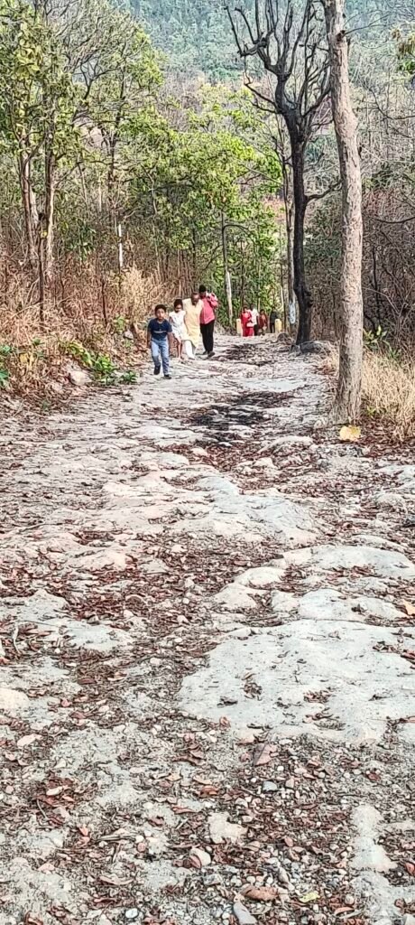 माता के दर्शन के लिए जाते श्रद्धालु। लेकिन दुर्गम पहाड़ी और अधूरी बनी है सीढ़ी देखें