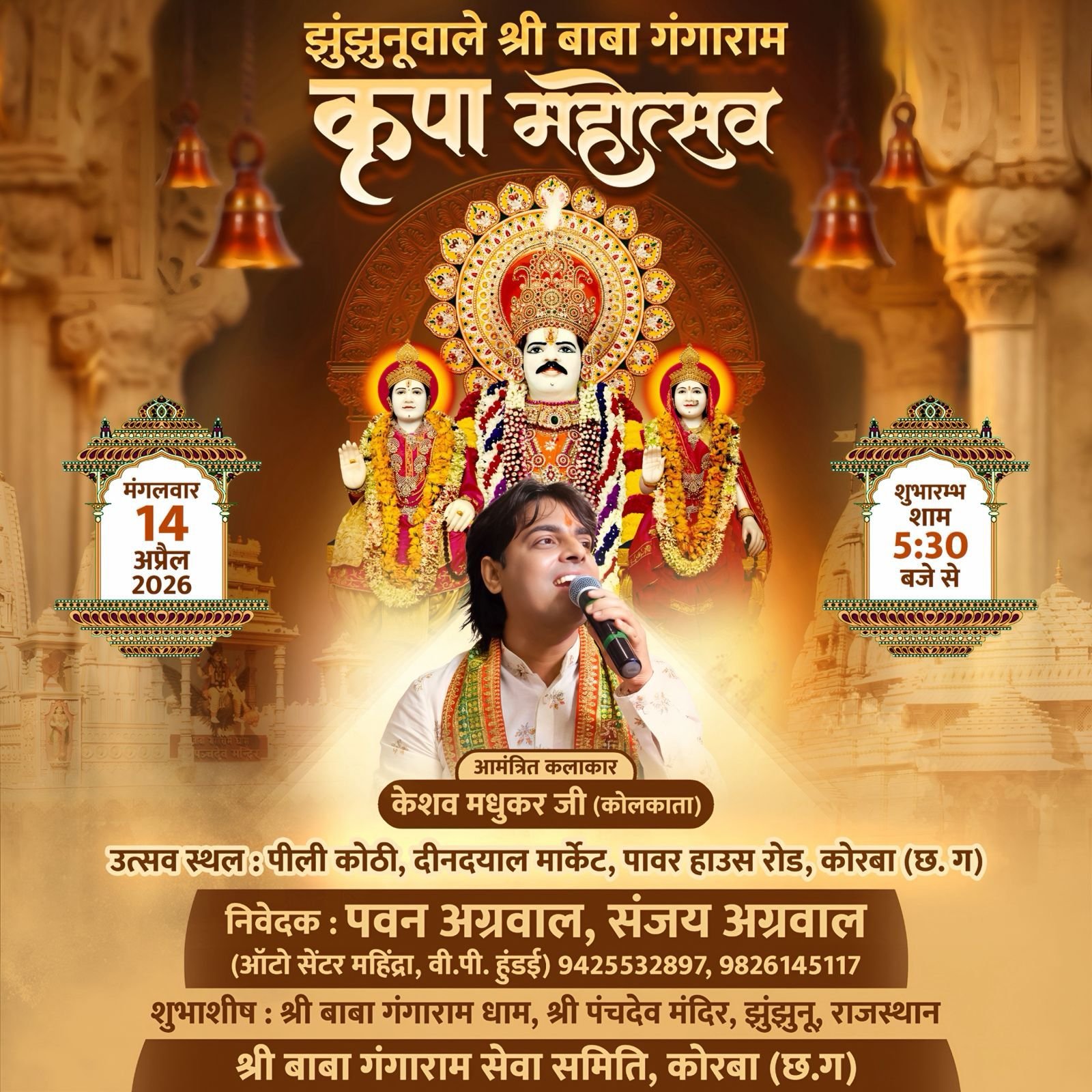 कोरबा। राजस्थान के झुंझुनूं जिले में स्थित प्रसिद्ध झुंझुनूंवाले श्री बाबा गंगाराम मंदिर की आस्था देशभर में फैली हुई है। इसी आस्था को लेकर कोरबा में भी 14 अप्रैल (मंगलवार) को श्री बाबा गंगाराम कृपा महा उत्सव का आयोजन किया जाएगा। यह कार्यक्रम शाम 5:30 बजे से दीनदयाल मार्केट स्थित पीली कोठी में संपन्न होगा।