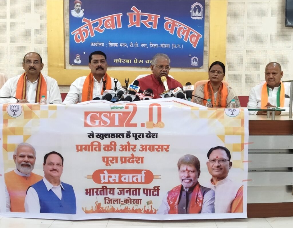 कोरबा। प्रेस क्लब कोरबा तिलक भवन में आयोजित प्रेस वार्ता में विधायक धरमलाल कौशिक ने जीएसटी 2.0 के विषय में विस्तारपूर्वक जानकारी दी। इस अवसर पर भाजपा जिलाध्यक्ष गोपाल मोदी, महापौर संजू देवी राजपूत, निवर्तमान जिलाध्यक्ष राजीव सिंह एवं पूर्व महापौर जोगेश लांबा उपस्थित रहे।
