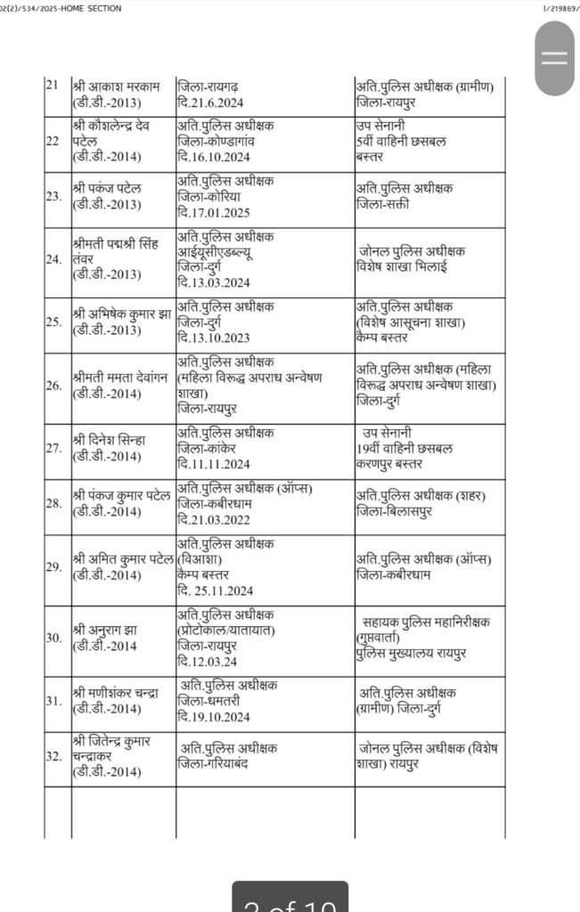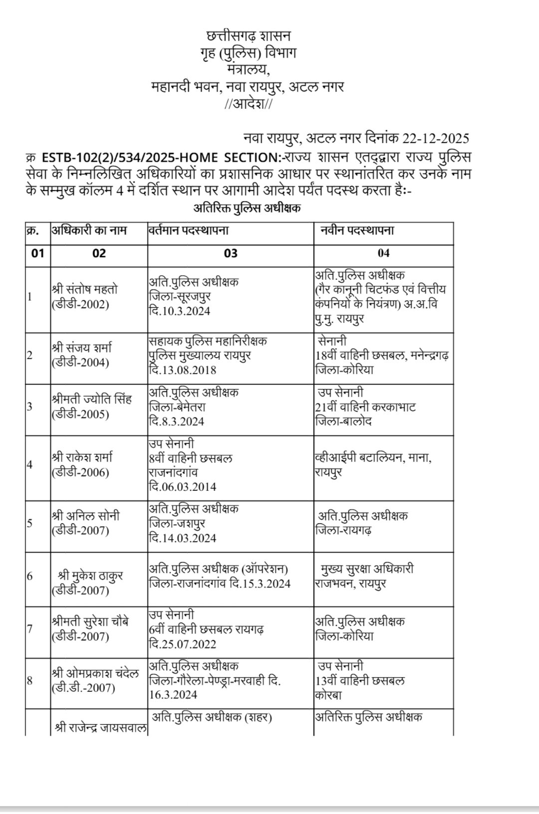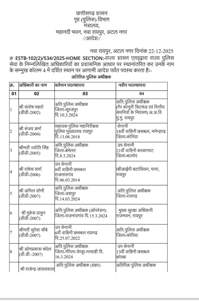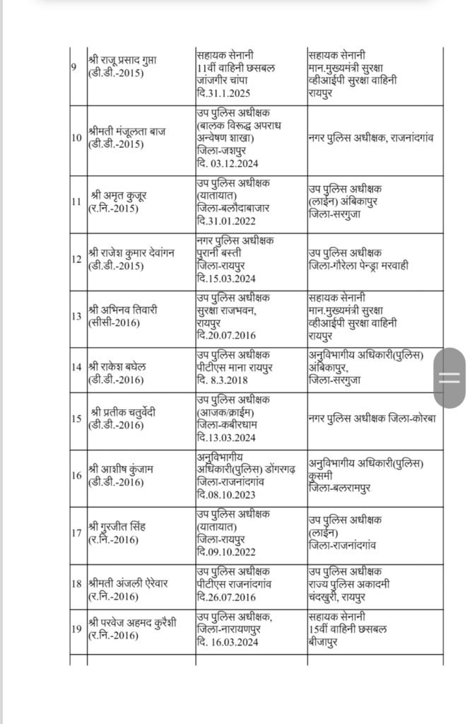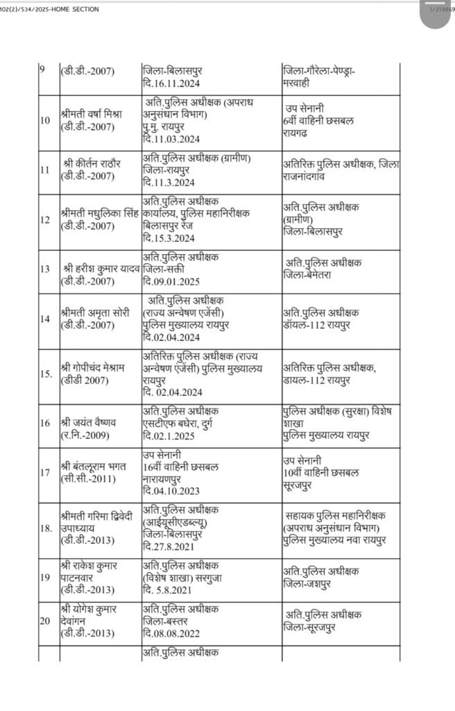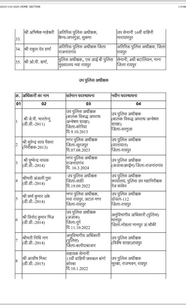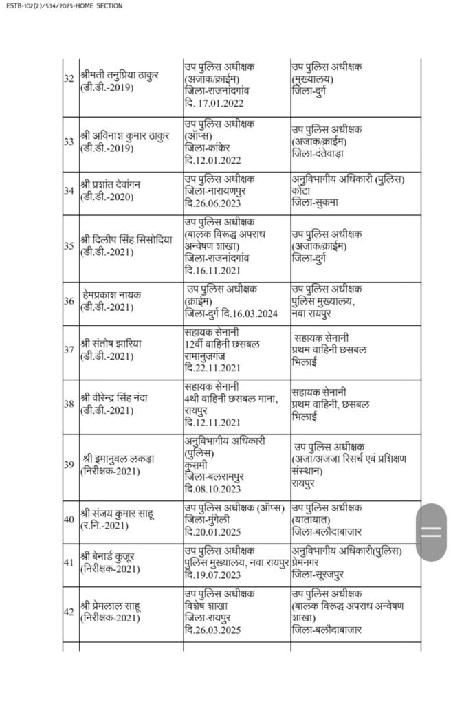 छत्तीसगढ़:- प्रदेश सरकार ने बड़ी संख्या में ASP DSP के तबादले किए। ट्रांसफर आदेश में 35 ASP और 60 DSP के नाम हैं। देखिए आदेश लिस्ट जारी