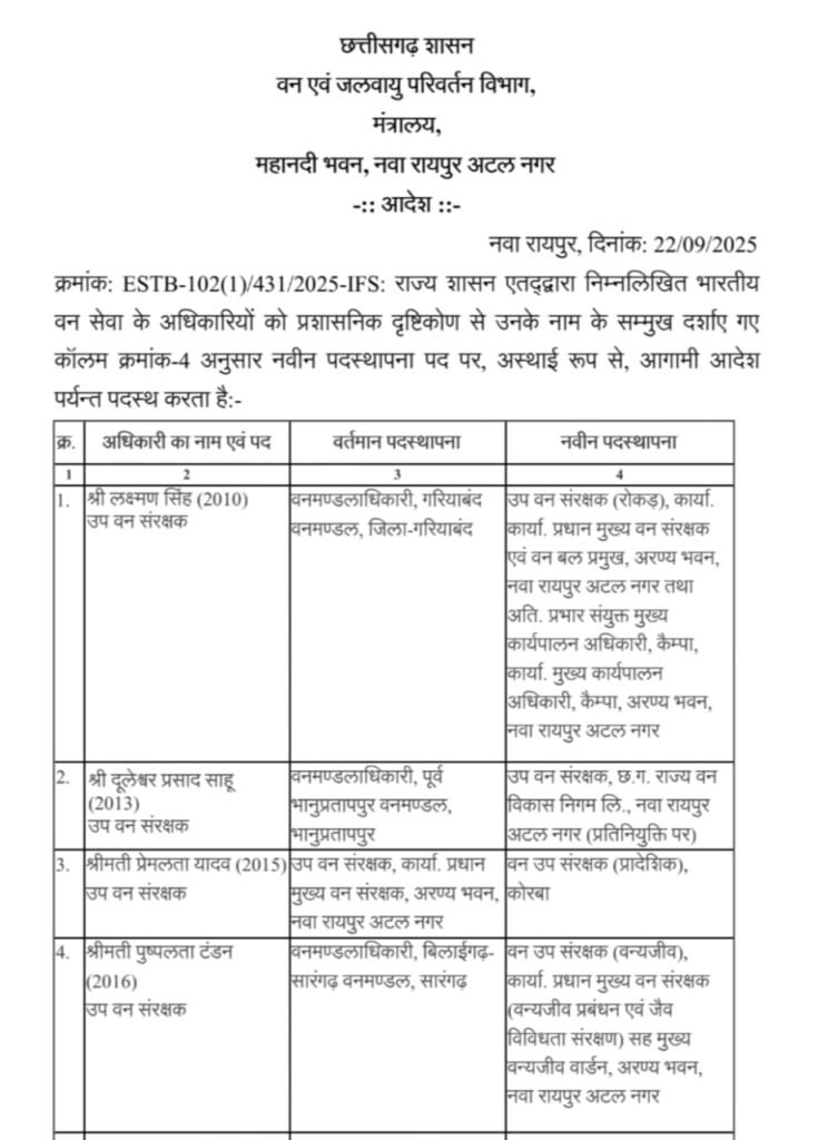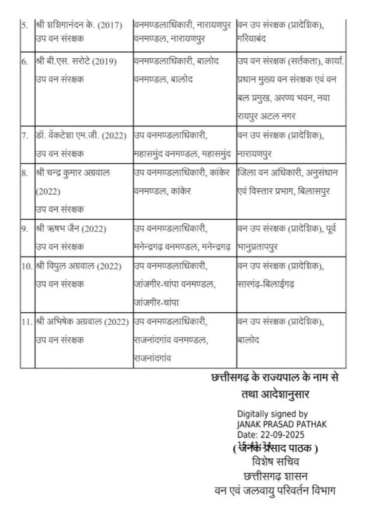 छत्तीसगढ़ में 11 IFS अधिकारियों का ट्रान्सफर, बदले गए कई वनमंडलों के DFO..देखें लिस्ट
