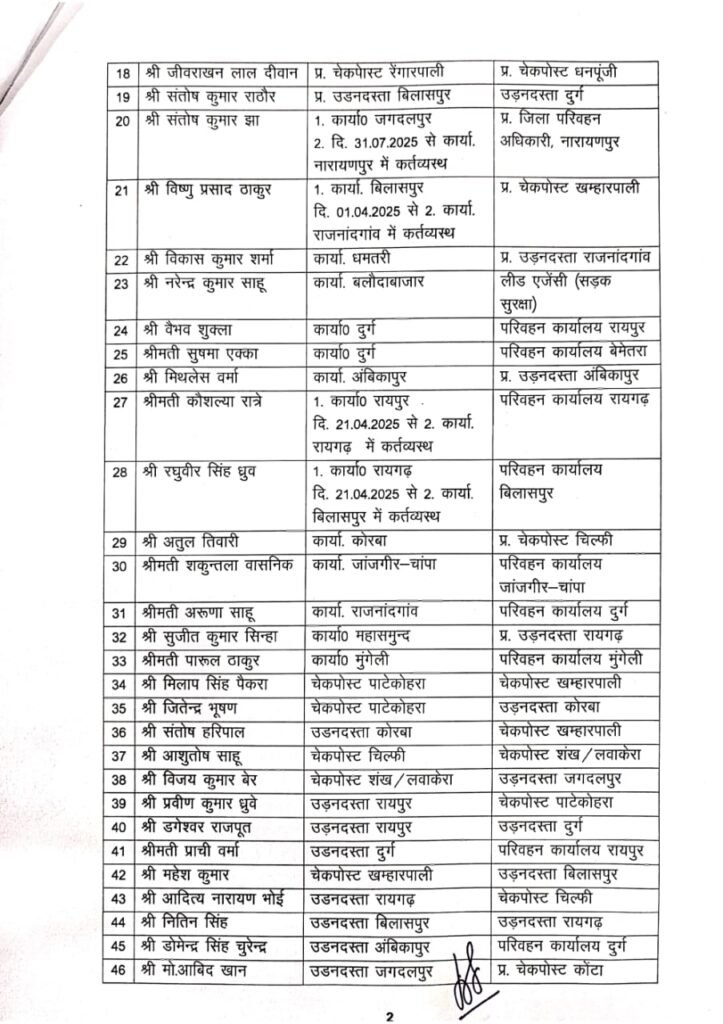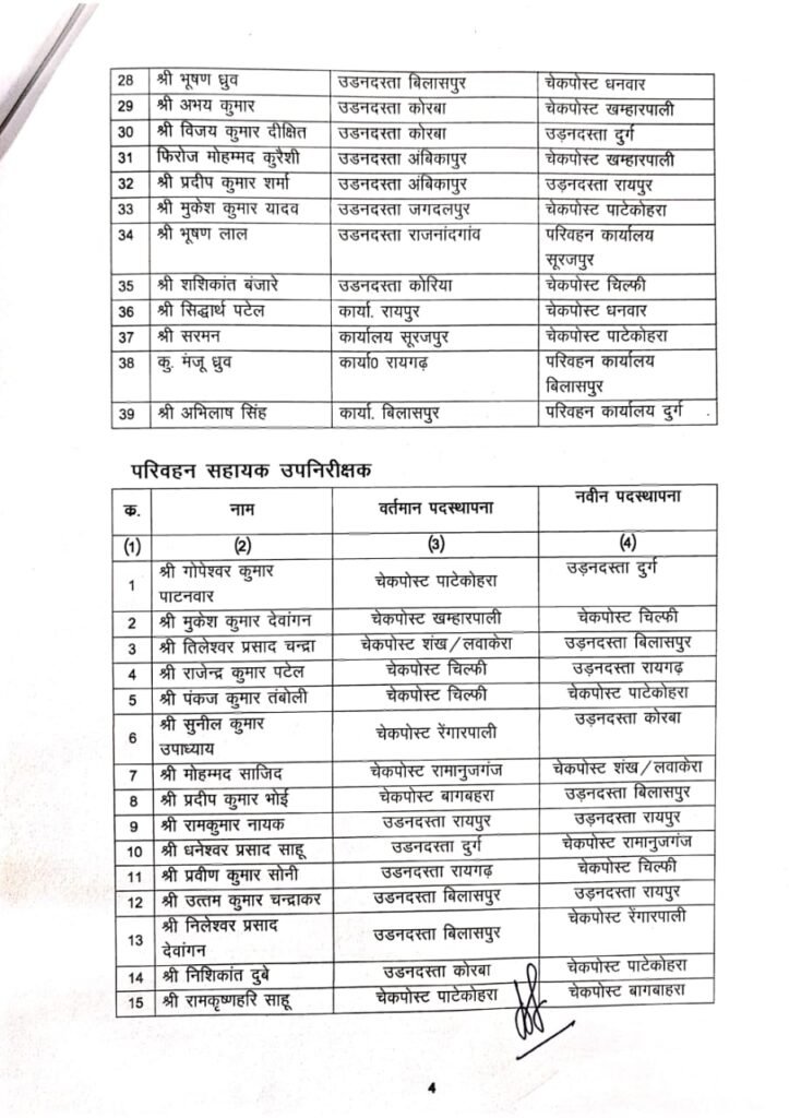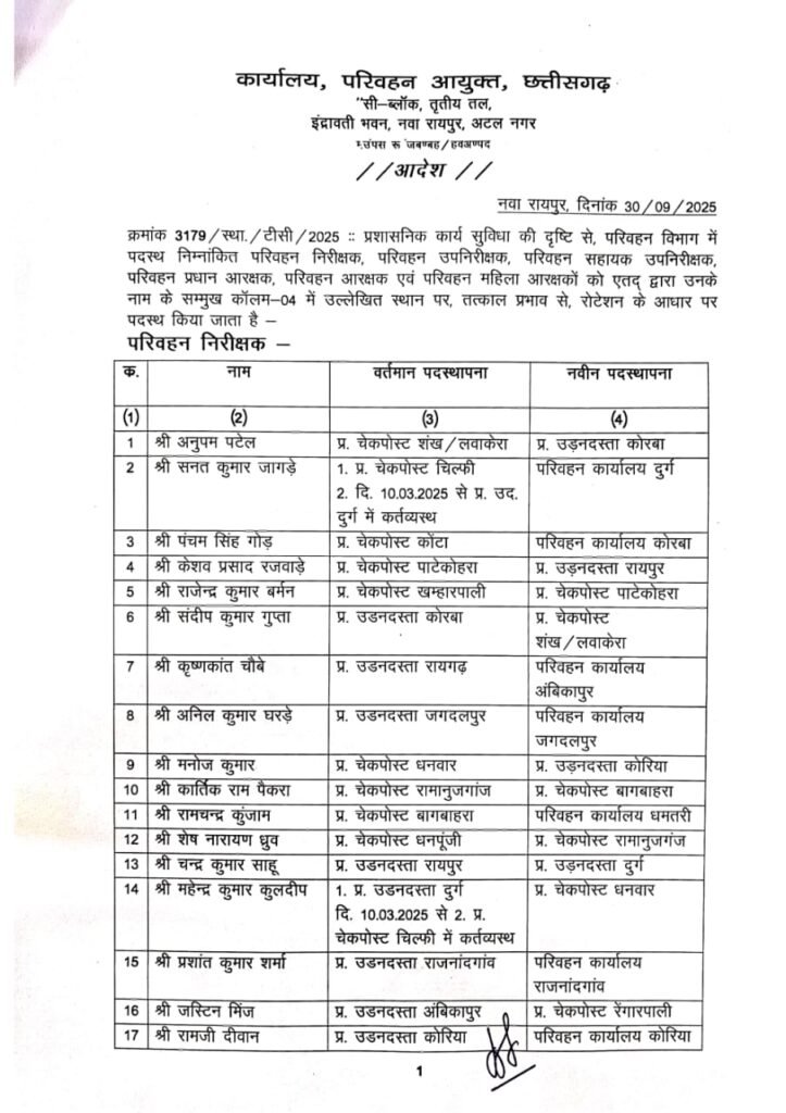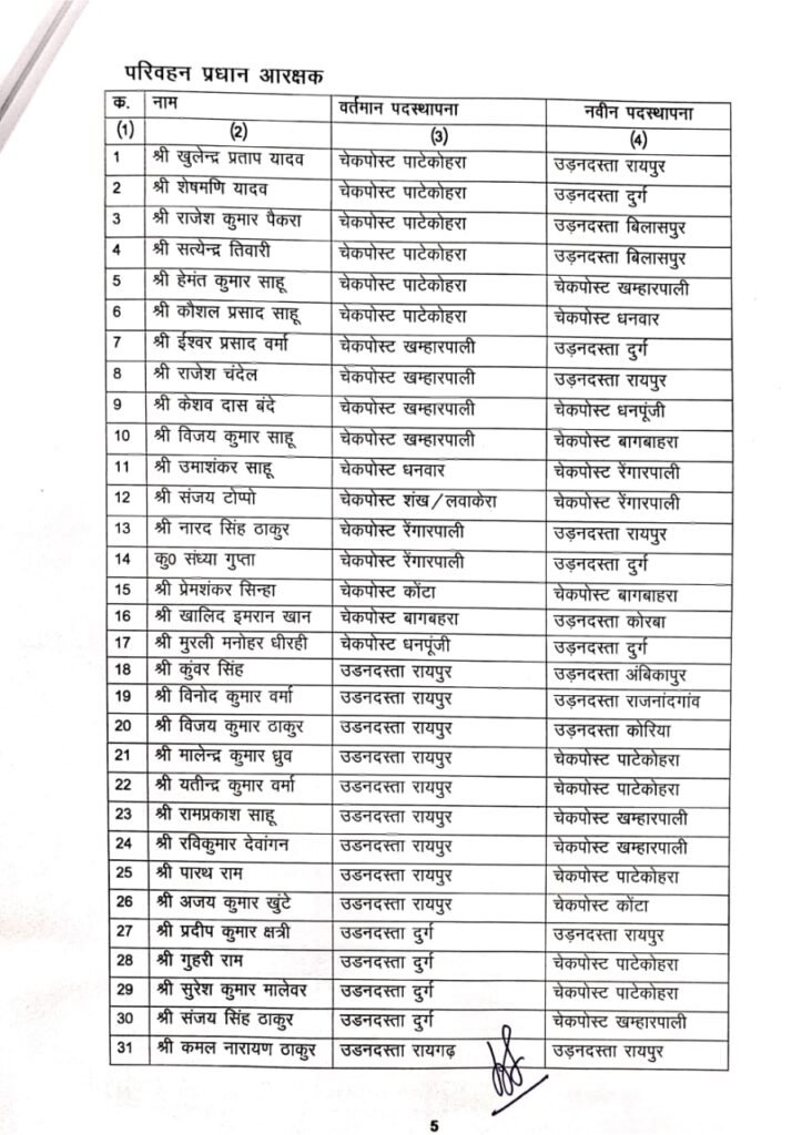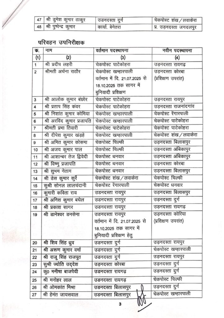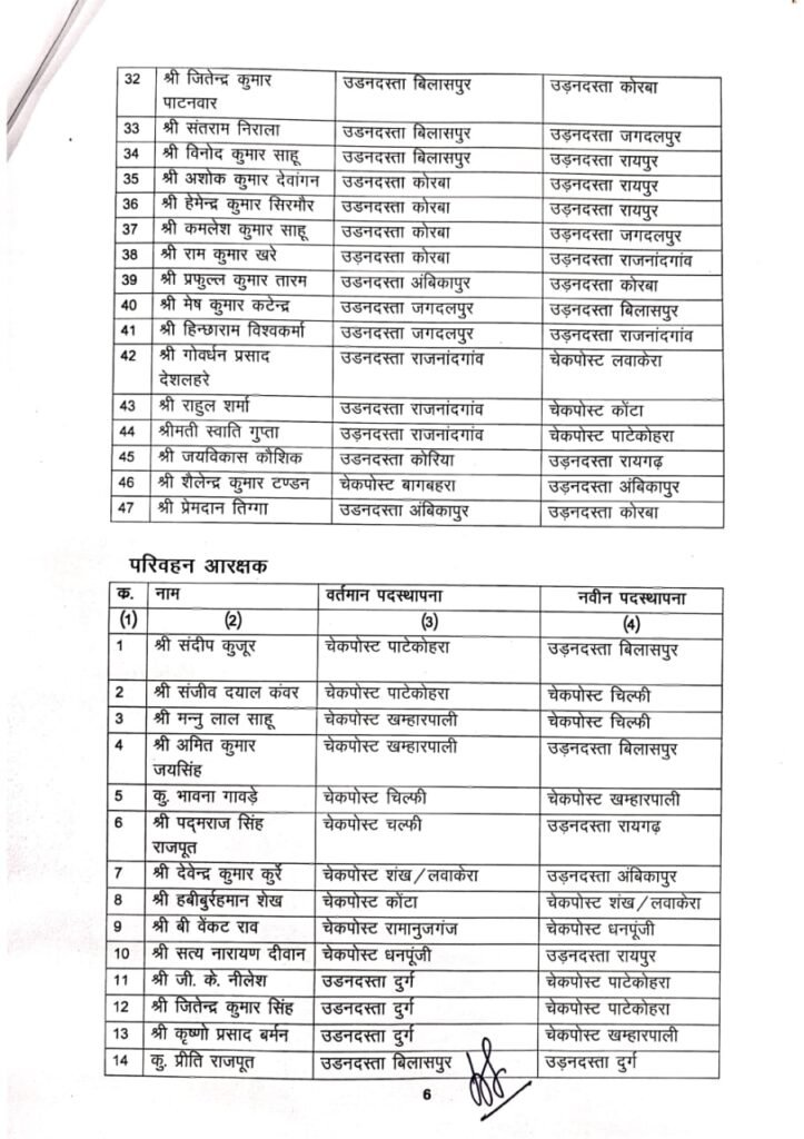 रायपुर। छत्तीसगढ़ परिवहन विभाग में पदस्थ परिवहन निरीक्षक, उपनिरीक्षक, सहायक उपनिरीक्षक, परिवहन प्रधान आरक्षक, परिवहन आरक्षक व परिवहन महिला आरक्षकों के तबादले हुये हैं।