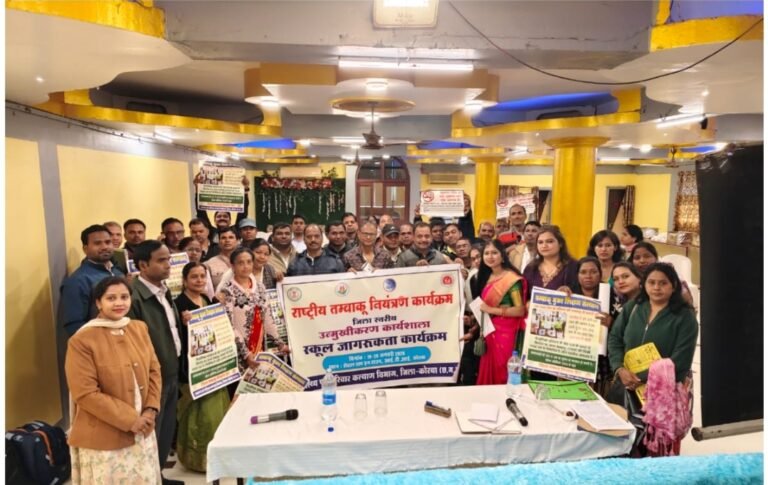 कलेक्टर कुणाल दुदावत के मार्गदर्शन में, मुख्य चिकित्सा एवं स्वास्थ्य अधिकारी डॉ.एस.एन.केशरी के नेतृत्व में दिनांक 19 एवं 20 जनवरी 2026 को जिले में तम्बाकू नियंत्रण कार्यक्रम के अंतर्गत शिक्षा विभाग के शिक्षकों हेतु कार्यशाला का आयोजन किया गया। इस कार्यशाला में जिले के 150 शिक्षकों ने भाग लिया। इस कार्यशाला में तम्बाकू से होने वाली हानिकारक बिमारियों, कैंसर, हृदय रोग, सांस लेने की समस्या और अन्य तंबाकू सेवन से होने वाले शारीरिक और मानसिक दुस्प्रभावों के बारे में जानकारी दिया गया , कोटपा अधिनियम 2003 की धाराओं को विस्तार से बताया गया साथ ही तम्बाकू सेवन से छुटकारा पाने तथा स्कूलों को तम्बाकू मुक्त शिक्षण संस्थान बनाने निर्धारित मापदंडों को बताया गया| कार्यशाला में जिला चिकित्सालय कोरबा में स्थित तम्बाकू नशामुक्ति केन्द्र में डी जा रही नि:शुल्क परामर्श एवं नि:शुल्क दवाइयों के बारे में जानकारी दिया गया | इसके साथ ही स्कूलों के लिए आईसी सामग्री तथा पाम्पलेट वितरित किया गया। इस कार्यशाला को संपन्न कराने में डॉ.कुमार पुष्पेंद्र