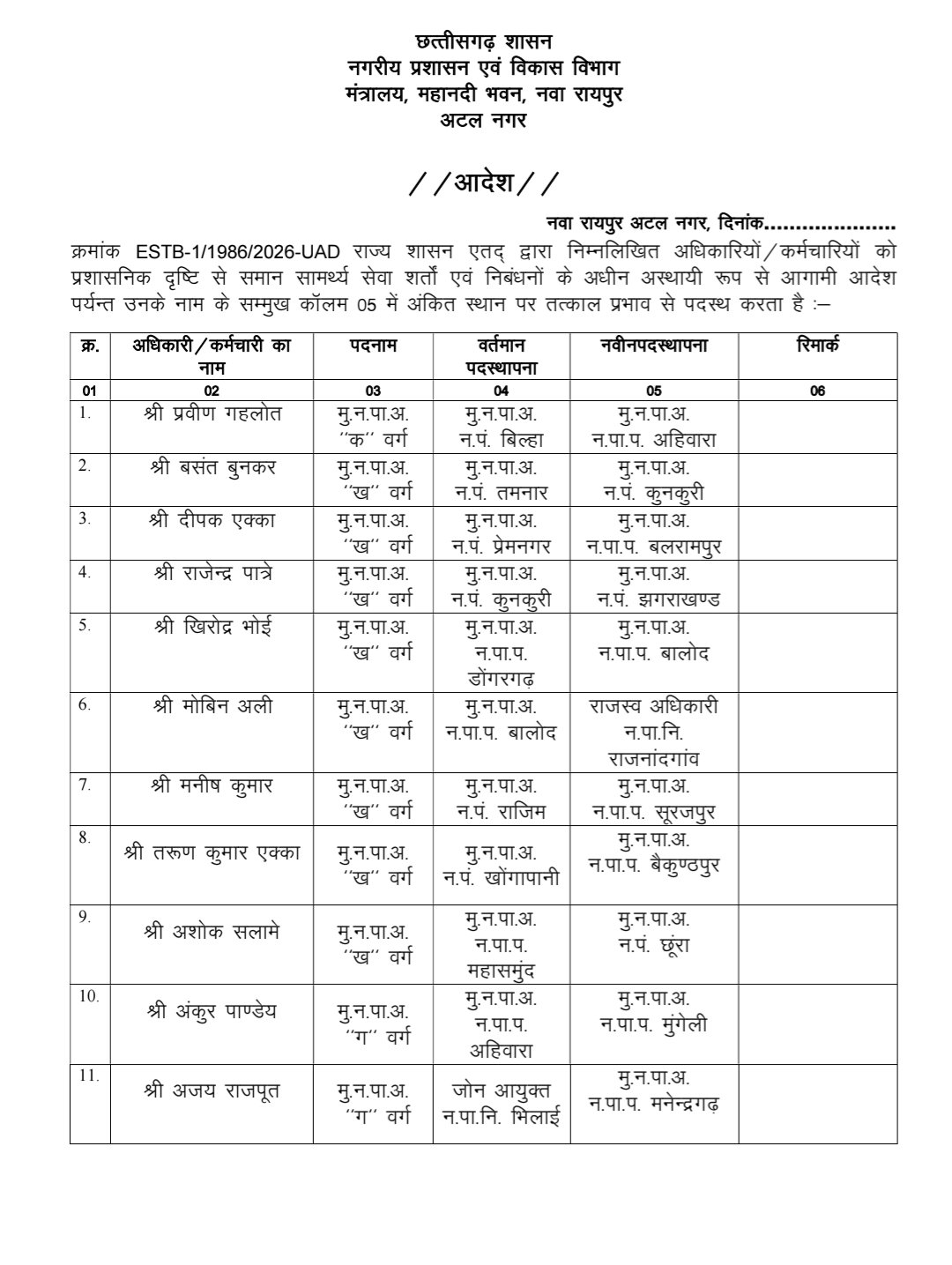 - रायपुर: प्रशासन विभाग में 37 अधिकारियों-कर्मचारियों के तबादले