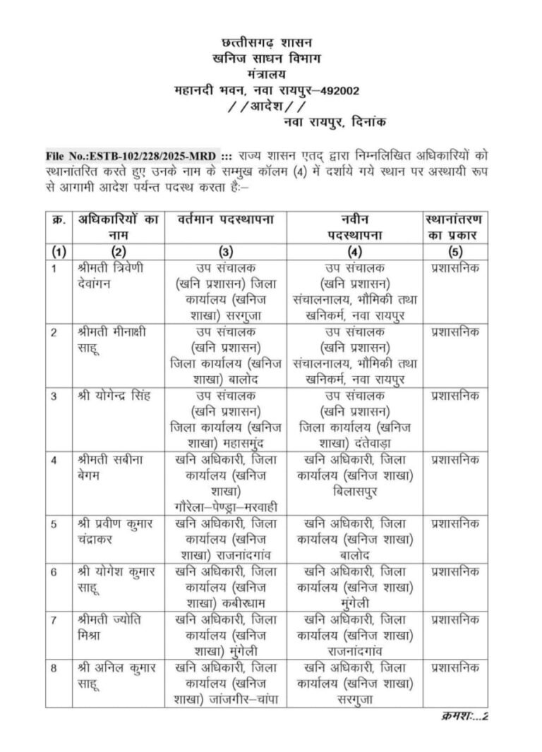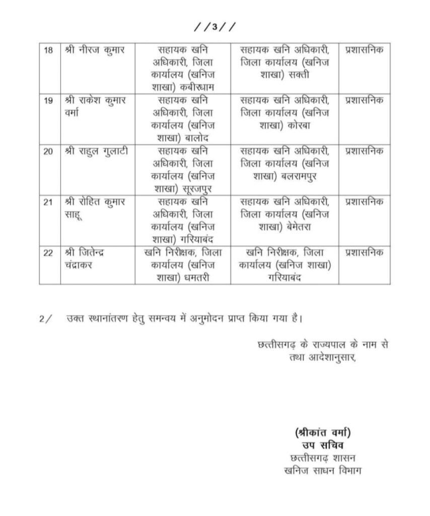 छत्तीसगढ़ में कोरबा सहित 22 खनि अधिकारियों का तबादला आदेश